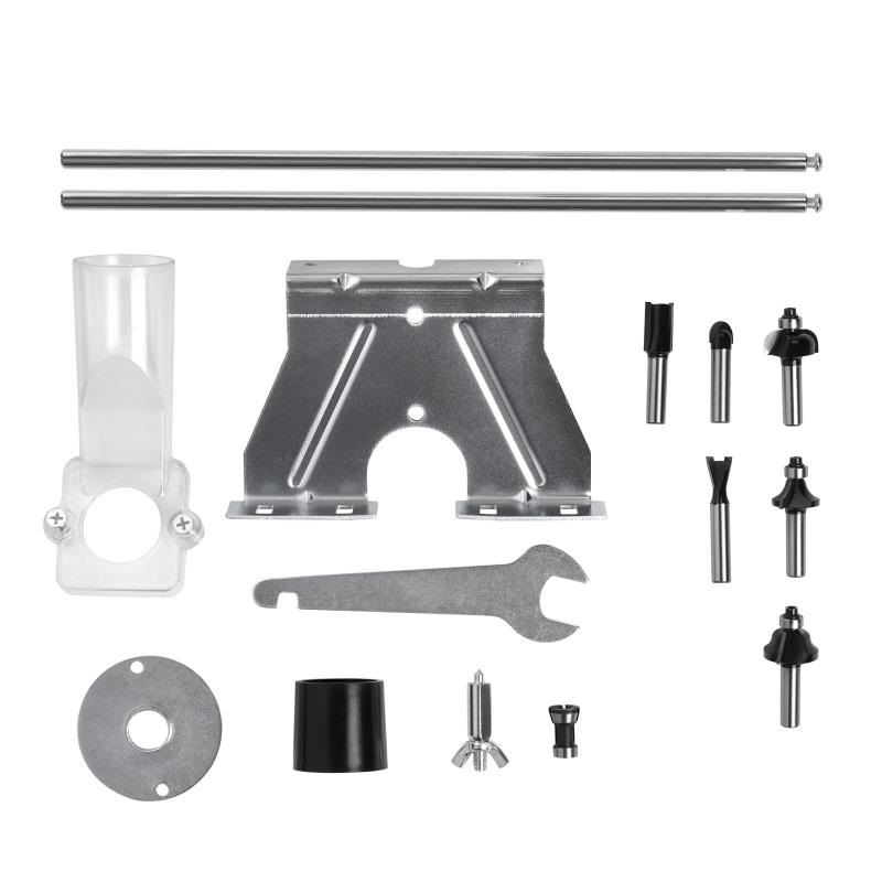 Комплект поставки: Фрезер 1 шт. Параллельный упор 1 шт. Патрубок для пылесоса 1 шт. Цанга (6 и 8 мм) 2 шт. Ключ 1 шт. Метчик 1 шт. Набор фрез 6 шт. 1 шт. Копировальная втулка 1 шт. Пылеотвод 1 шт. Руководство по эксплуатации 1 шт.
