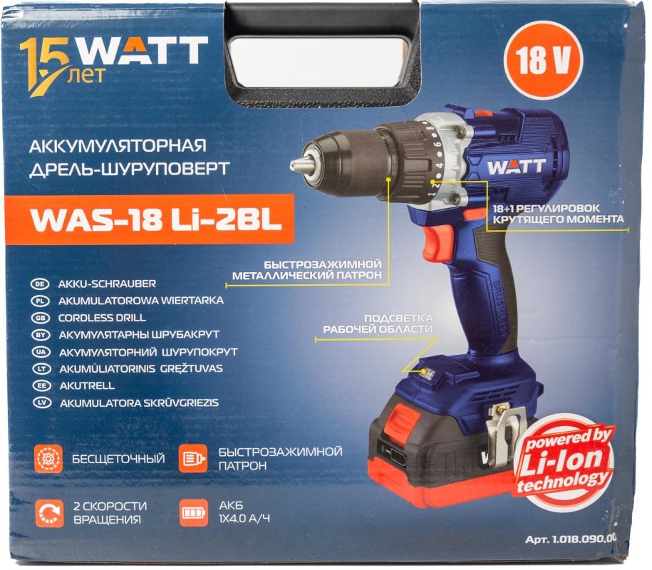 1.018.090.01 Шуруповерт WATT WAS-18 Li-2BL (2×4.0 Ah)