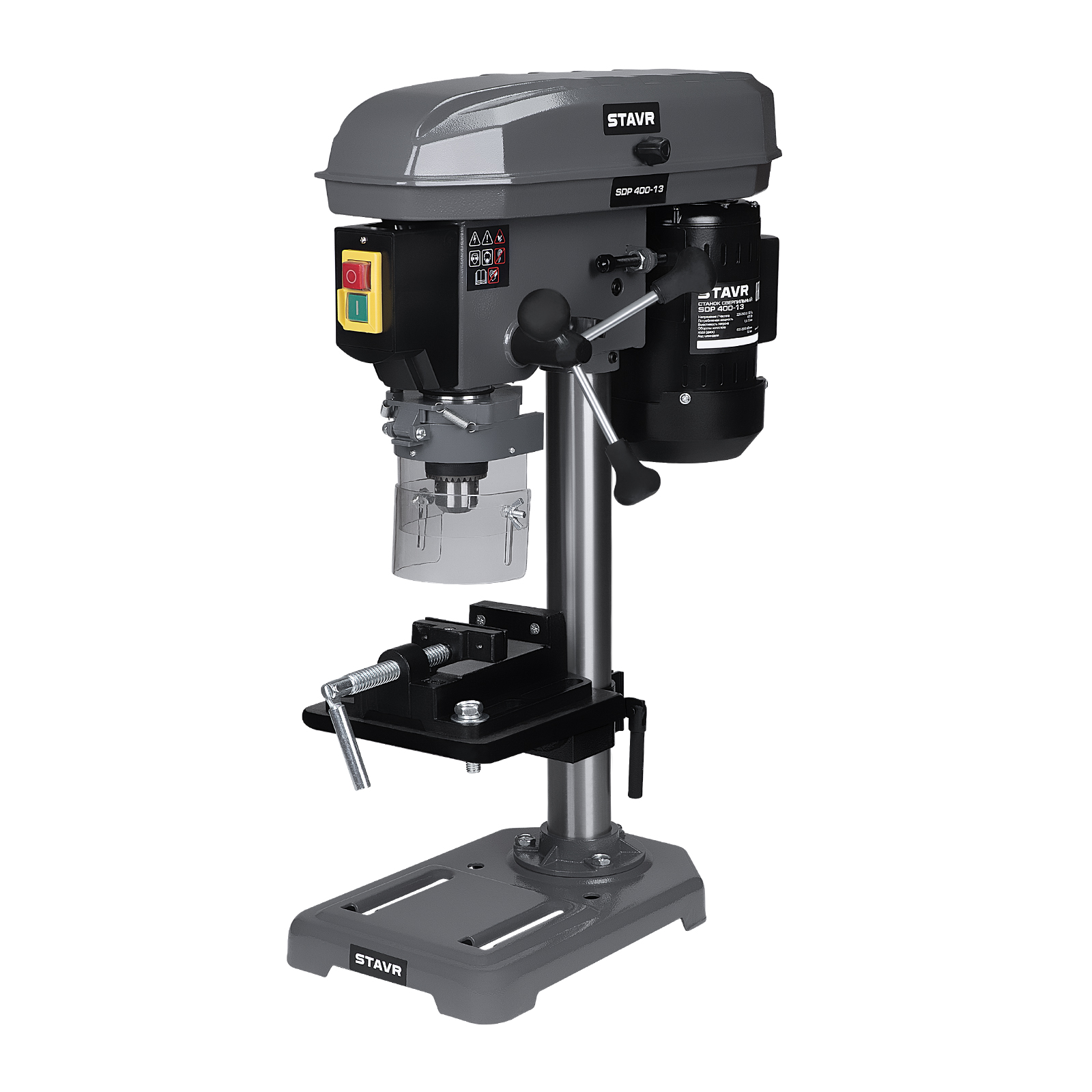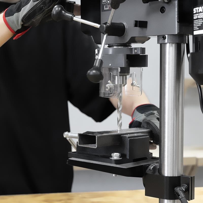 Особенности: Простой и надежный станок для точного сверления. Асинхронный двигатель, не требующий обслуживания. Ременная передача с 5 скоростями для любых работ с разными материалами. Кулачковый патрон с посадкой В16. Регулировка глубины сверления. Прозрачный кожух для видимости заготовки и защиты оператора от стружки. Рабочий стол, регулируемый по высоте, углу наклона и в осевом направлении. Тиски для фиксации заготовки идут в комплекте.