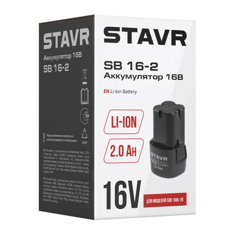 Описание.: Подходит для дрели-шуруповёрта SDD 16BL-2K. Для зарядки рекомендуется использовать ЗУ STAVR SBC 16-1A. Подходит для зарядки штекерным ЗУ на 16В.