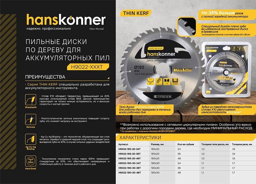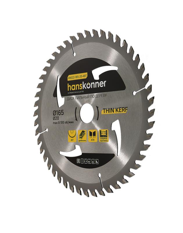 H9022-165-20-48T Диск пильный 165×20×1.6 мм, 48 зубов, по дереву, Hanskonner