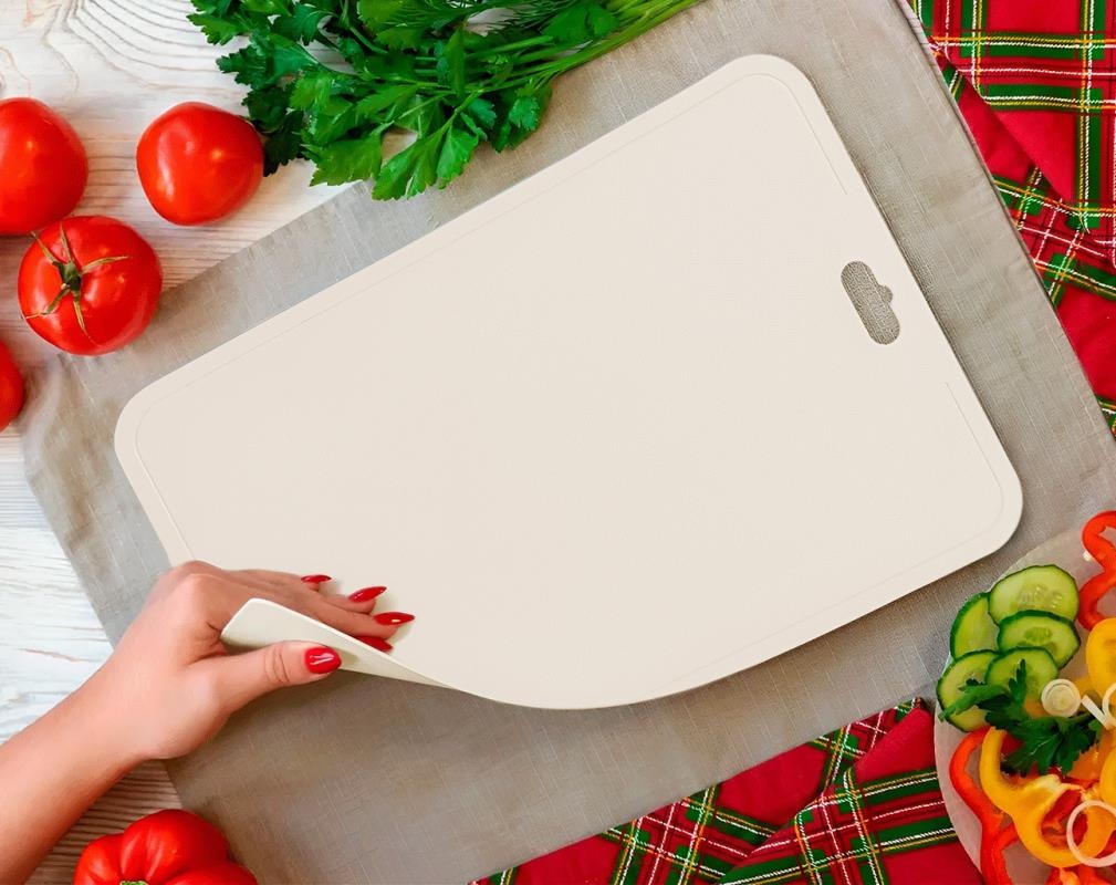 Максимум удобства для тех, кто ценит комфорт на кухне! Гибкая доска макси идеально подойдёт для разделки мяса, рыбы, крупных овощей и теста. Её эластичная поверхность легко принимает нужную форму, позволяя одним движением направить нарезанные продукты прямо в ёмкость. А после использования — можно повесить доску за специальное отверстие на крючок, чтобы она всегда была под рукой и не занимала место на столешнице.