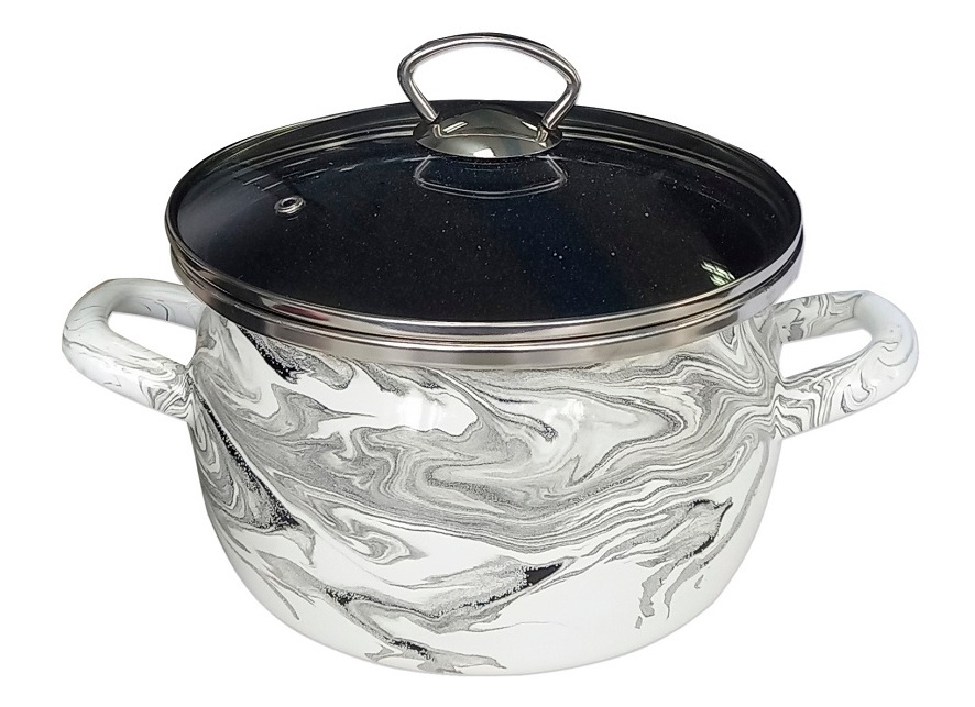 Код: 1-2450111(Сер.гр.) Цвет эмали (внутри/снаружи): Серый гранит/Шейк Бело-Черный Деколь: нет Форма: сферическая Артикул: 1-2450111 Объём: 5,0 л Нержавеющий обод: есть Ручки на корпусе: полые Крышка: стеклянная, нержавеющий ободок на крышке тип G Ручка на крышке: нержавеющая тип «Кольцо» Толщина металла: 0,7 мм Тип упаковки: транспортная