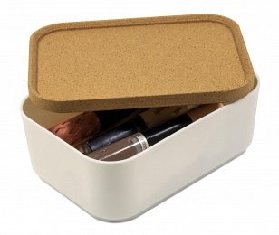 Корзина с крышкой Korely mini объемом 0,76 л подойдет для хранения декоративной косметики и маникюрных принадлежностей. Крышка сделана из экологически чистого и возобновляемого материала – коры пробкового дерева. Ее срезают, когда дерево достигает 25-летнего возраста. Процесс повторятся каждые 9-10 лет, что помогает восстановить слой коры и не вредит деревьям. Крышка с бортиками может использоваться как отдельная подставка для мелочей. Боксы можно устанавливать друг на друга для экономии пространства. Корзина Korely mini - это уменьшенная версия Корзина Korely maxi, созданная специально для мелочей. Например: косметика, аксессуары, спонжи и другие мелочи. Изделие дополнит любой интерьер нежностью и уютом. Данное изделие выполнено в редком сочетании материала (пробчатый) и цвета (слоновая кость). Преимущества данных изделий: выполнено из высококачественного пластика, который отличается долговечностью; изделие не впитывает запахи. Литраж 0,74 л Размер 159 х 114 х 65 мм