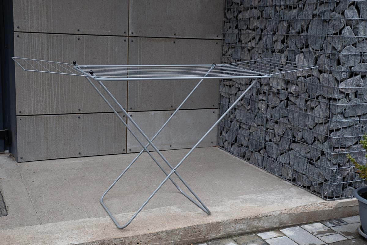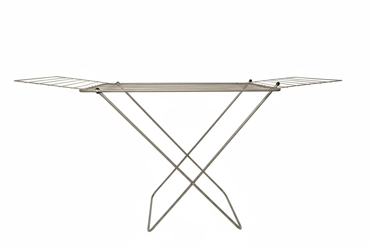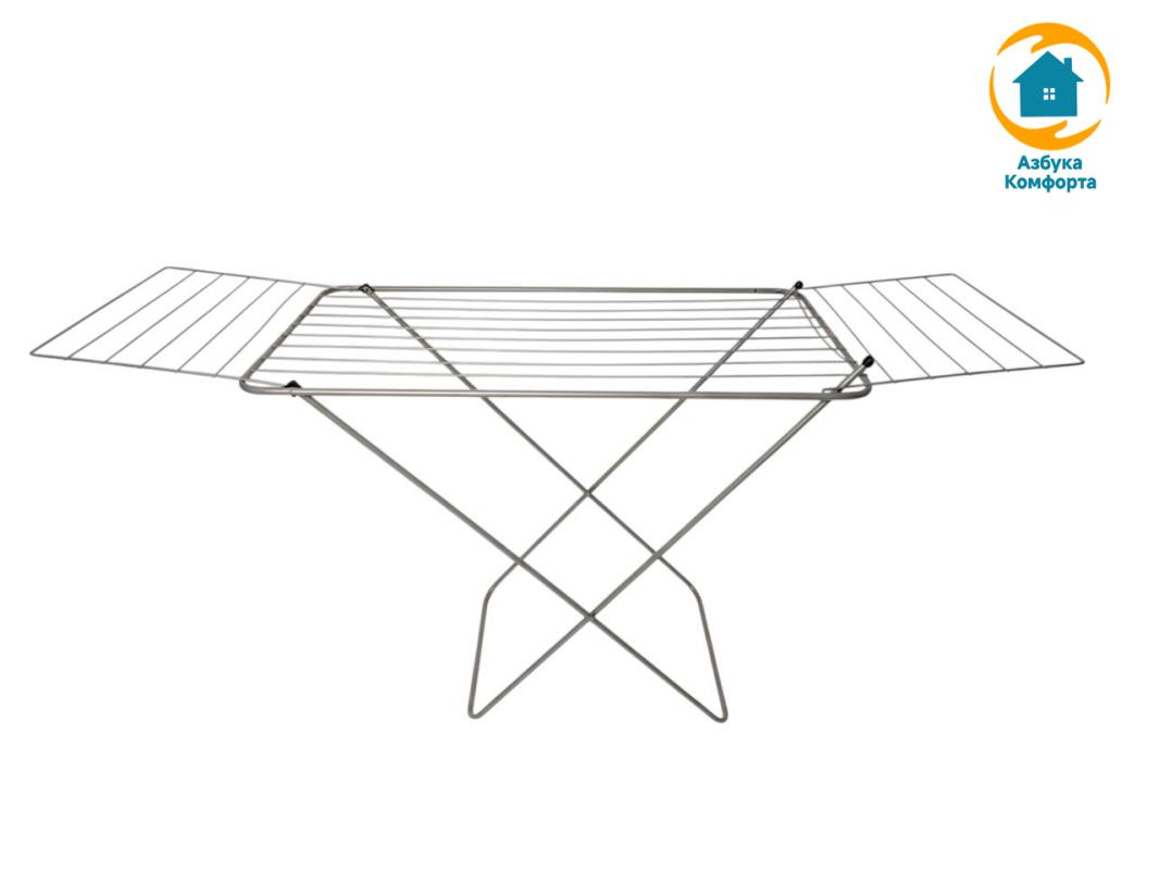 Особенности: - Компактная и устойчивая сушилка; - Имеет съёмные облегчённые крылья из проволоки 3 мм для мелких вещей; - Удобный и надежный механизм раскладывания; - Пластиковые колпаки на ножках сушилки защищают пол от царапин; - Все углы сушилки плавно скруглены. - Серебристый цвет.