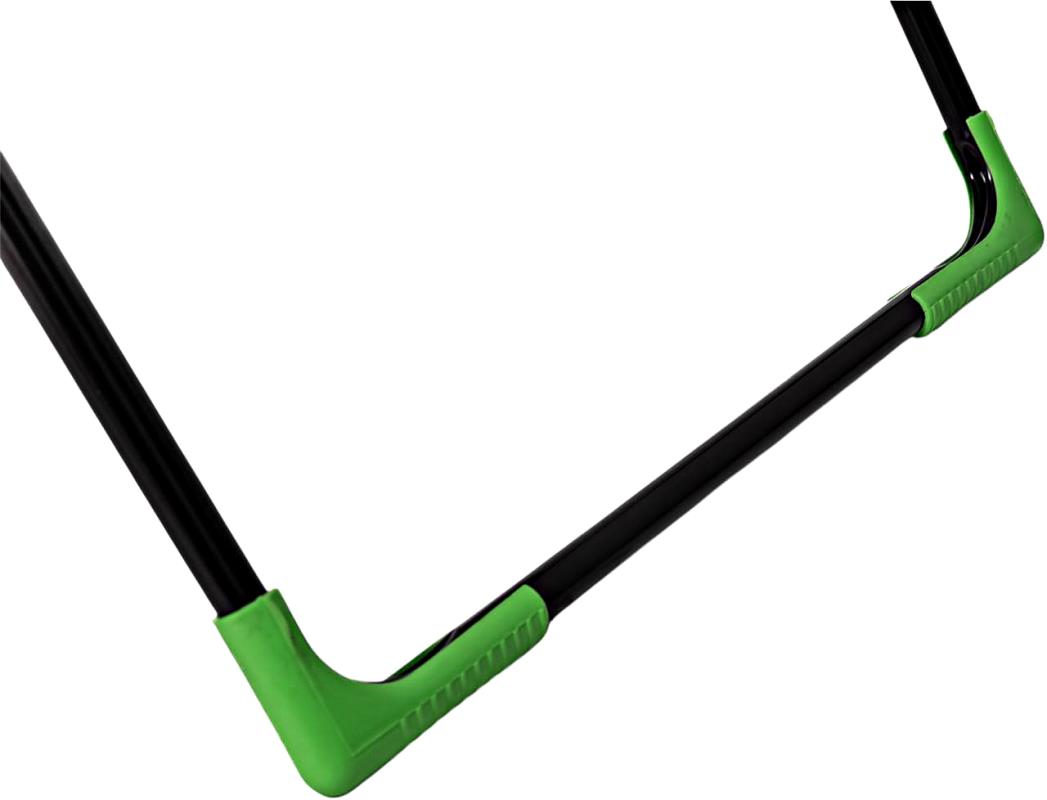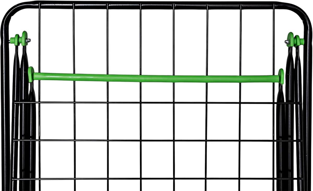 Характеристики: Размер в сложенном виде: 131,5х55х5 см Опоры (сечение, трубы) (+-5%): 16х0,6 мм Рама (сечение, трубы) (+-5%): 16х0,6 мм Крылья (сечение, трубы) (+-5%): 16х0,6 мм Прутки (сечение проволоки): 4 мм Длина рабочей поверхности (+-5%): 18 м Максимальная полезная нагрузка (+-5%): 20 кг Высота в рабочем положении (+-5%): 90 см Высота в рабочем положении "крылья" (+-5%): 103 см Вес нетто (+-5%): 3,6 кг Цвет: черный